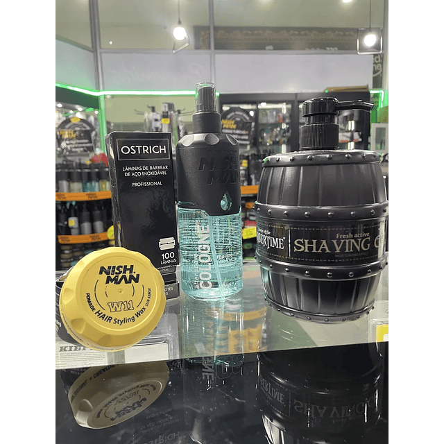 kit de barbero opcion 1 incluye :1 caja de 100 hojillas ostrish (para 200 cortes)1 Colonia nishman modelo 04 - 400ml 1 shaving gel de afeitar de 1000 ml1 Cera brillo nishman w10