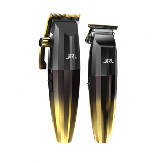 Pack JRL Gold compuesto por una máquina FF 2020T ideal para el diseño de líneas y el afeitado y una máquina FF 2020C especial para un corte profesional y preciso con función avanzada de bloqueo de palanca.Ambas cuentan con avanzada tecnología Cool Blade donde la cuchilla se mantiene fría y afilada incluso después de su uso prolongado.Cuchilla fija de acero inoxidable de alta calidad y hoja móvil de titanio, fuerte y resistente al desgaste, para un corte suave y preciso. Avanzado sistema Cool Blade, mantiene la cuchilla fría. Con tecnología Smartclip para evitar que la máquina arrastre o se detenga, y función avanzada de bloqueo de palanca.Características:* Tecnología de cuchillas frías.* Smart-Clip Tecnology para mantener constantes las revoluciones del motor.* Indicador LED (duración de batería)* Bloqueo de palanca para trabajos prolongados* Bateria de Iones de Litio con duración máxima de 4h y un tiempo de carga de 3h.* Tipo de motor: rotatorio de 6.5W de bajo sonido* Revoluciones: de 6000 a 7200 rpm* Ajuste de cuchillas: 0.5 a 3.5mm (puede ajustarse a 0mm)Complementos:* Destornillador* Cepillo de limpieza* Lubricante* Peines: 10 peines (0.5, 1.5, 2, 3 ,4, 5, 6, 7, 8)* Adaptador de cargador* Protector y ajustador de cuchillas zero gap.